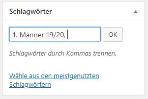 Wenn du einen neuen Beitrag verfasst, kannst du (auf dem PC oder Laptop) in der rechten Sidebar eine Kategorie und Schlagwörter für deinen Beitrag auswählen. Mit der Kategorie wird die richtige Sportart erfasst. Das ist wichtig, damit dein Beitrag in vielen Übersichten überhaupt erscheint! Für den Bereich Fußball gibt es noch eine weitere Unterteilung. Jede Mannschaft hat ihre eigene Unterseite, auf der die Spielergebnisse, Fotos und Beiträge zu sehen sind. Damit dein Beitrag hier erscheint, musst du das richtige Schlagwort (Tag) angeben. Gib einfach den Namen deiner Mannschaft, z.B. E2-Junioren, in das Suchfeld ein und wähle das Schlagwort für die aktuelle Saison (z.B. E2-Junioren 20/21). Nicht vergessen auf „ok“ zu drücken!. Dann erscheint dein Beitrag auch automatisch auf deiner Mannschaftsseite.